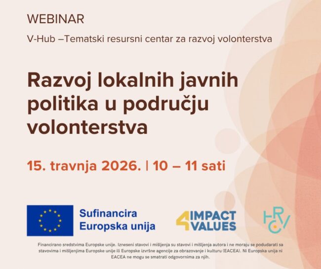 Zašto je važno razvijati lokalne javne politike u području volonterstva? Poziv na webinar „Razvoj lokalnih javnih politika u području volonterstva“ dana 15.4.2026. koji je namijenjen volonterskim centrima i organizatorima volontiranja koji žele bolje razumjeti: zašto su važni lokalni planovi i programi volontiranja, zašto je uključivanje različitih dionika ključno za njihov razvoj i provedbu, kako ovi…
