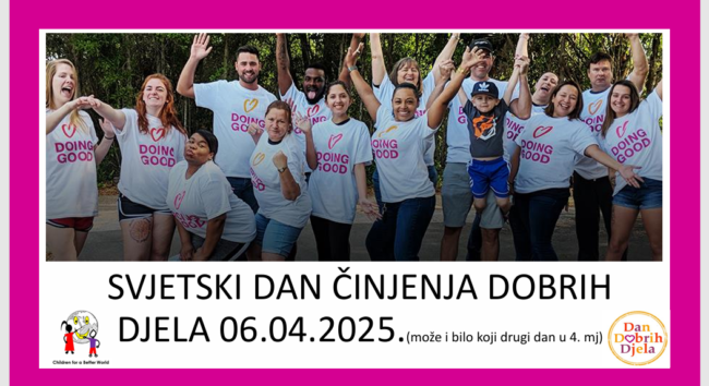 I ove godine udruga Djeca za bolji svijet poziva na obiježavanje Svjetskog dana činjenja dobrih djela u vašoj lokalnoj zajednici, kada će u više od 110 zemalja svijeta, preko 5 milijuna ljudi također činiti razna dobra djela. Svjetski dan činjenja dobrih djela obilježava se 6. travnja (može i bilo koji drugi dan tijekom travnja). Udruga…
