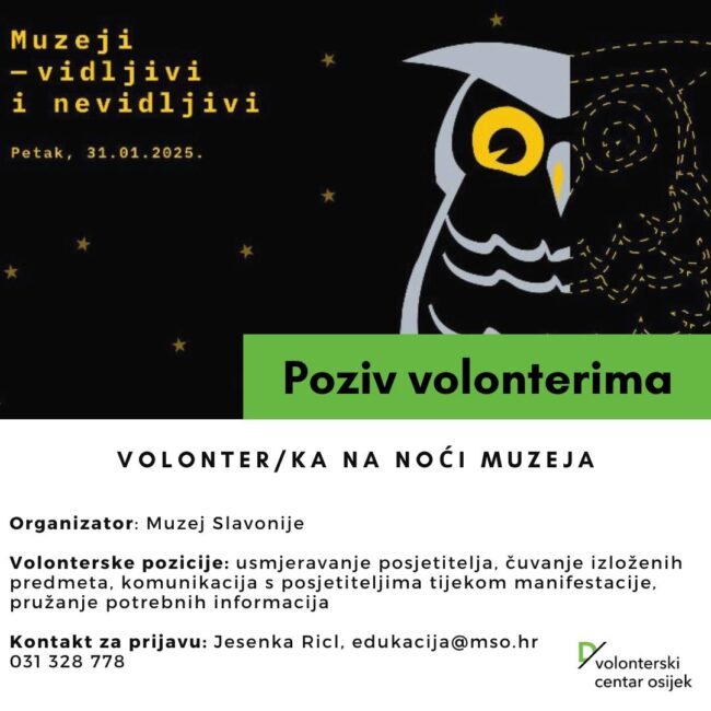 Noć muzeja 2025. odvija se u petak, 31. siječnja 2025. od 17 do 23 sata. Muzej Slavonije tradicionalno je u potrazi za volonterima, tako da je ovo izvrsna prilika da se prijavite!Muzej treba vašu pomoć u usmjeravanju posjetitelja, čuvanju izloženih predmeta i komunikaciji s posjetiteljima tijekom manifestacije te pružanju potrebnih informacija.Kako biste dobili mogućnost volontiranja, prijavite…