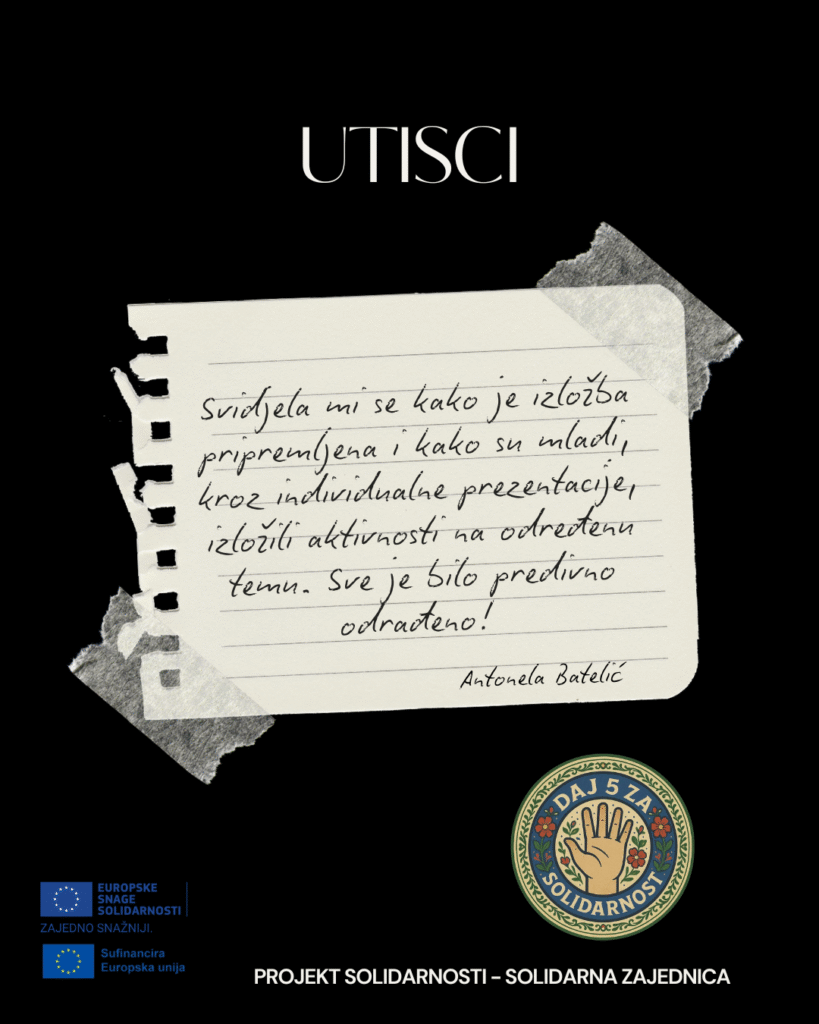 Projekti solidarnosti kroz program Europske snage solidarnosti su idealna prilika za mlade koji se žele okušati u inicijativama i projektima za zajednicu. Utisci drugih sudionika dokaz su da je ova izložba bila zanimljiva i potrebna.