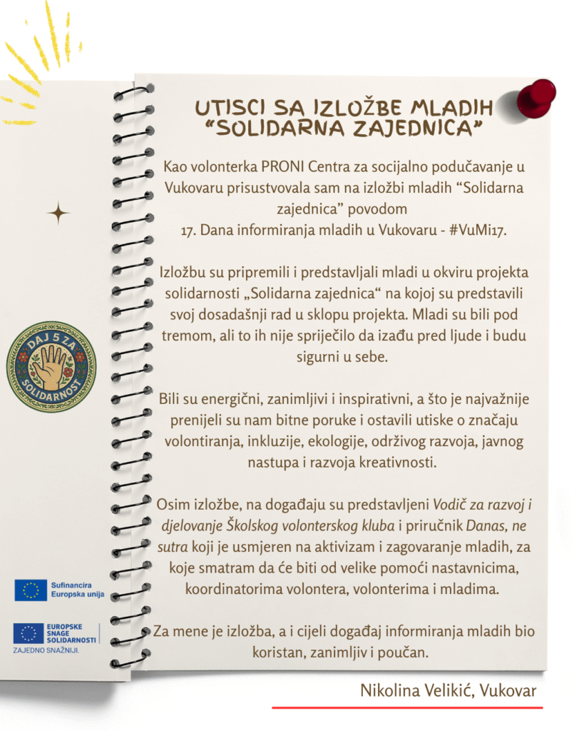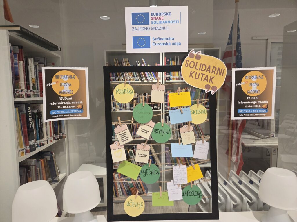 Izložba mladih “Solidarna zajednica” bila je ujedno dio 17. Dana informiranja mladih u Vukovaru u organizaciji Info centra za mlade Vukovar/PRONI Centra za socijalno podučavanje na kojoj se okupio veliki broj djece, mladih, predstavnika udruga i obrazovnih ustanova, kao i predstavnika iz Grada Vukovara. Izložba mladih se organizirala u petak, 20.2.2026., u prostoru Gradske knjižnice Vukovar – odjel za mlade Spajalica. Zahvaljujemo se svima na dolasku i podršci mladima na projektu solidarnosti.