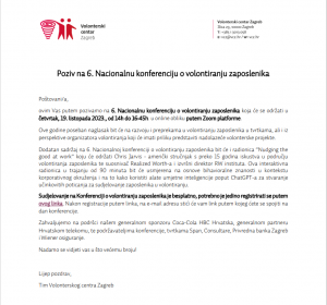 Hrvatski centar za razvoj voloterstva poziva vas na 6. Nacionalnu konferenciju o volontiranju zaposlenika koju organizira Volonterski centar Zagreb i koja će se prenositi online – putem Zoom platforme.