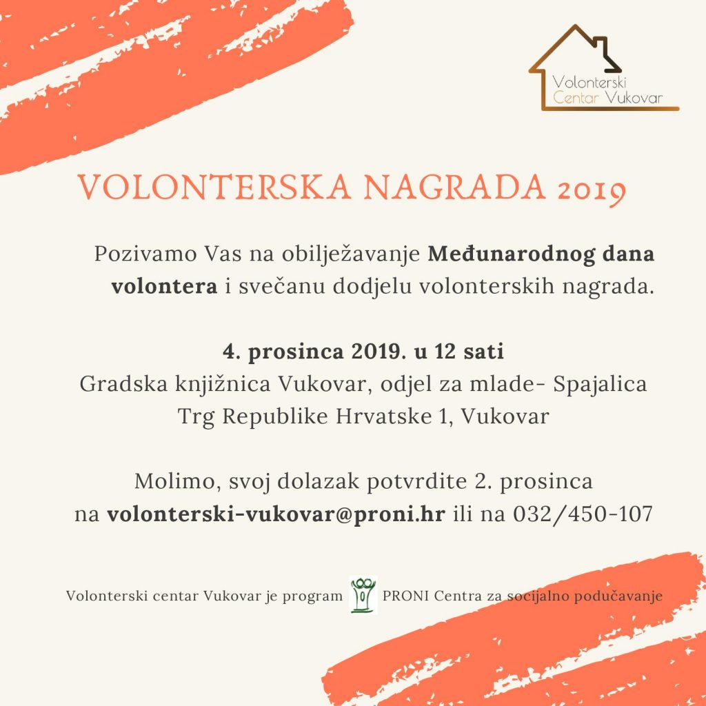 Volonterski centar Vukovar poziva Vas na obilježavanje Međunarodnog dana volontera i svečanu dodjelu volonterskih nagrada za 2019. godinu!