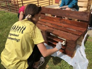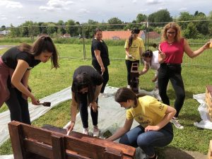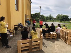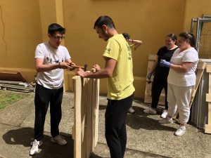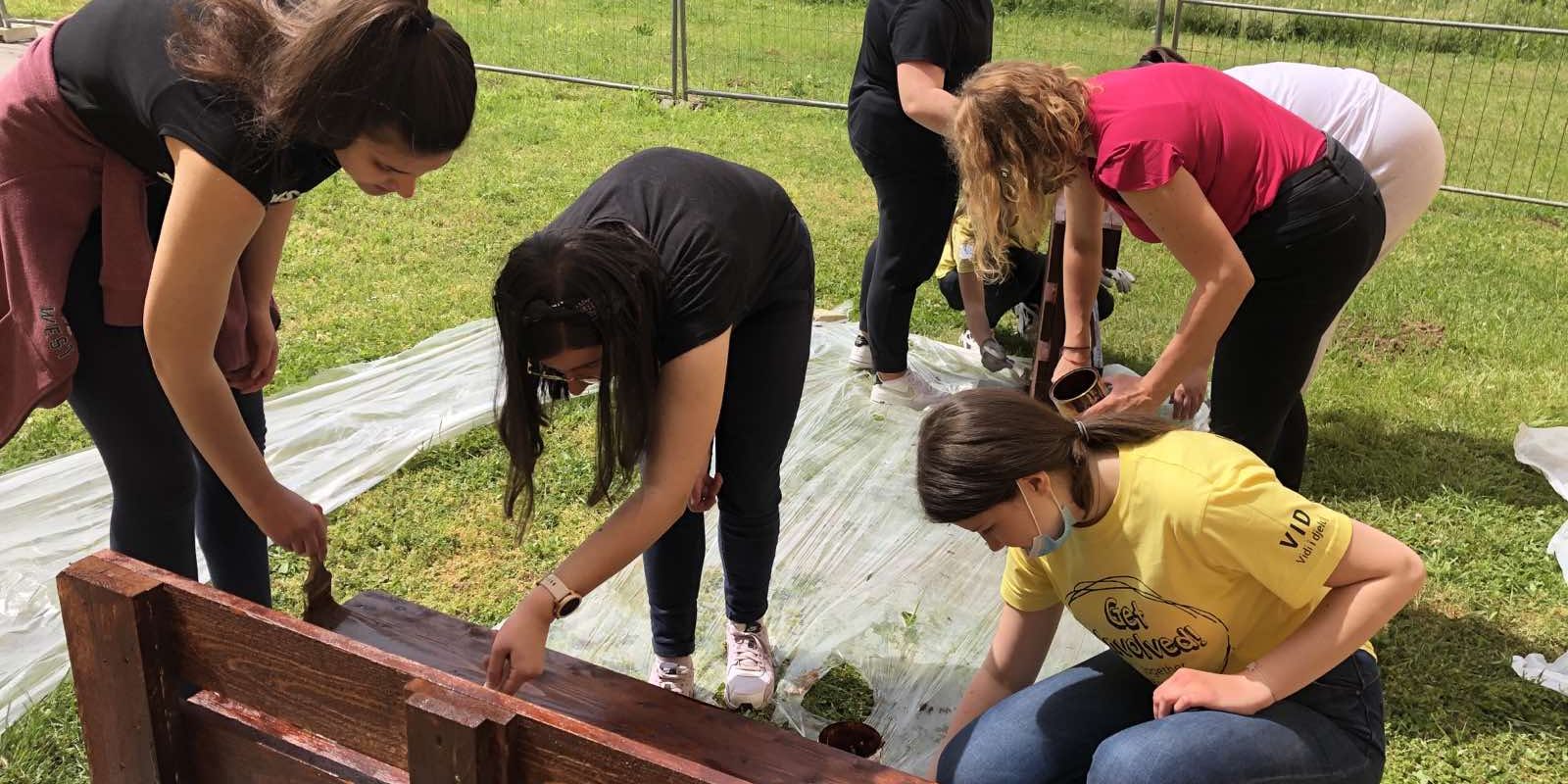Učenici i volonteri su započeli fazu pripreme i bojanja paleta za izradu garniture i vertikalnog vrta te će u narednim danima sklopiti garnituru i posaditi bilje u vertikalni vrt.